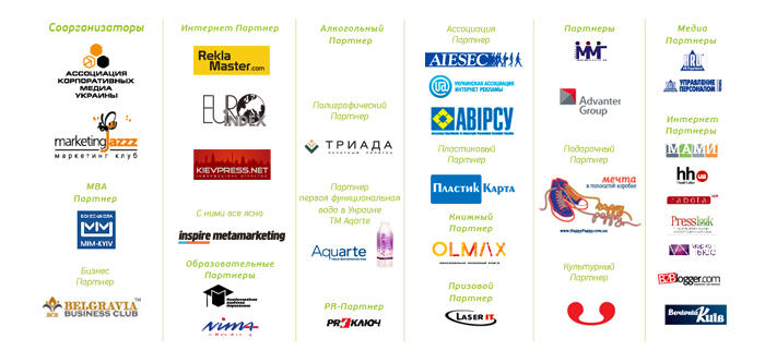 ЧАО «Футбольный клуб «Шахтер» (Донецк); ООО "НПК "Горные машины"; АО "Укрэксимбанк" ; Южный Фондовый Магазин; ООО "Винфорт"; Издательская группа «Свой редактор»; ООО «Донбасская фармацевтическая компания»; ПАО «Крафт Фудз Украина»; Издательско-консалтинговая компания "Баланс-Клуб"; VAB Банк(ПАО «Ви Эй Би Банк»); Студия корпоративных коммуникаций "Горизонт Медиа"; Коммерческий банк "Хрещатик"; Украинская биржа; ООО "ЖАН"; ООО «Торговый Дом «ЕвразРесурс» Украина»; ПАО «Мироновский хлебопродукт»; ПрАТ «Київстар»; ПАТ „Львівобленерго”; ФПГ «Альтком»; Університет банківської справи НБУ; ПП "КЛМ Група"; ДТЭК; ПАТ "КРЕДИТПРОМБАНК; Райффайзен Банк Аваль, компания "Торговый Дом НИКО", ООО "Предприятие "СтеклоПЛАСТ", ПАТ Страхова компанія "Універсальна", Компания "Фокстрот. Техника для дома", CustomLAB (ИД Sanoma Magazines Ukraine), FitCurves (ФитКервс), OTP Bank, АТ «Прикарпаттяобленерго», НАСК "Оранта", ЧП Парадигм Консалтинг Группа, ПАО "Днепроэнерго", Группа компаний Winbau, ANROM, ПрАТ «РЕНОМЕ», ООО «Параллель – М ЛТД», ПАТ "Концерн Галнафтогаз", ПАО ПУМБ, Телекоммуникационная группа Vega,  ПАО АБ "Пивденный", ПАТ "ФИТОФАРМ", ООО «Лавринович и Партнеры», МТС Украина, Корпорация S.I.GROUP, клиника ISIDA, Страховая компания БРОКБИЗНЕС, Группа АГРОТРЕЙД, Харьковский национальный экономический университет, PR-агентство «аPRель», Виноторговая компания «Витис Групп», АО «СБЕРБАНК РОССИИ», ПрАТ «СК «Перша» и др.