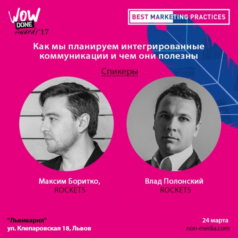 24 марта, на конференции Best Marketing Practices во Львове Влад Полонский, CEO, Rockets и Максим Боритко, партнер практики интегрированных коммуникаций Rockets расскажут о том, как они планируют интегрированные коммуникации и чем они полезны. Аккредитацию можно оформить до 17 марта на non-media.com.