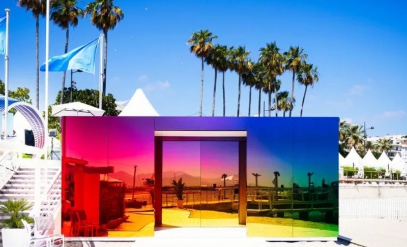 Эта структура расположилась на пляже Facebook на территории фестиваля Cannes Lions. От нее до воды рукой подать. Павильон облицован зеркальными панелями всех цветов солнечного спектра. Внутри посетителям предлагают снять обувь и пройтись по белой поверхности, отражающей свет, под кристаллическим/призматическим проектором. Это прекрасный повод «найти идеальный кадр для Instagram».