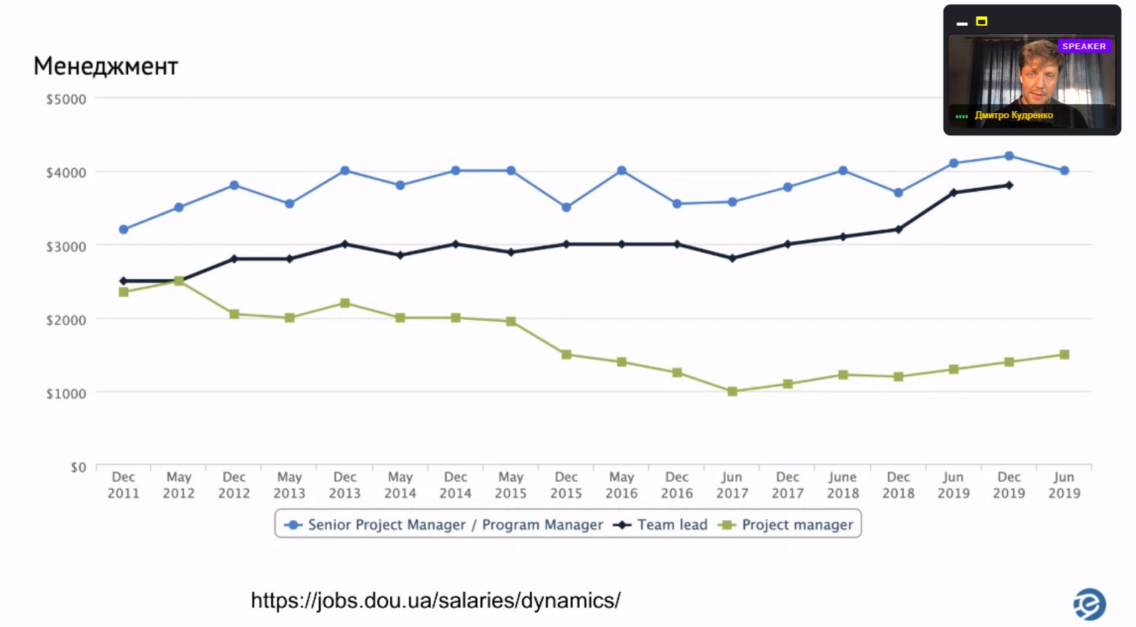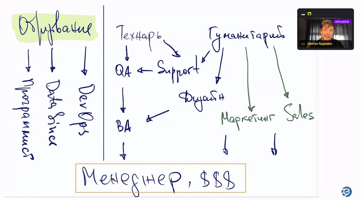 Далі Дмитро Кудренко розглянув основні схеми входу й шляхи руху технічних спеціалістів та гуманітаріїв в IT. «Найвища планка в IT — менеджер, з зарплатою в районі $4000» — зазначив спікер.