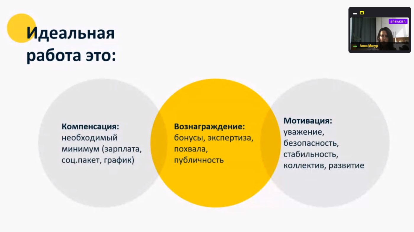 «Крім вас, ніхто не знає, чого ви бажаєте. Ніхто не знає, хороший ви чи поганий, гідний чи ні. Але вже є купа стереотипів проти вас» — так описала Анна концепцію, якою потрібно керуватись для адекватного самосприйняття та позиціювання. Також вона розібрала поняття культури компанії та докладно пояснила, чому ідеальна робота — це комплексне поняття, яке не полягає лише в грошовому еквіваленті.