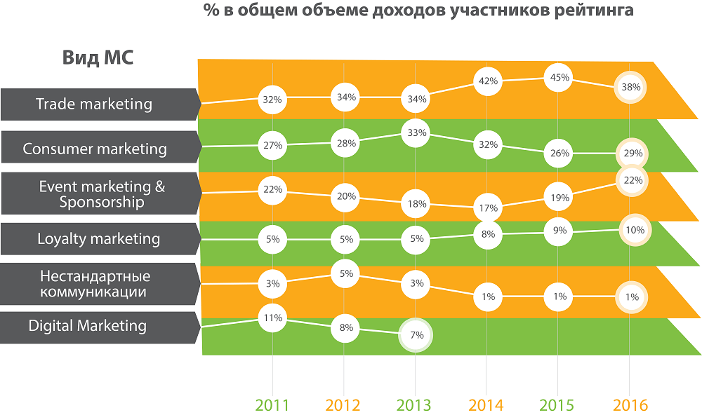 Несомненно, рынок "ожил", о чем свидетельствует рост интереса к ивент маркетингу -  до 22%, как в дореволюционном 2011.  Инвестиции в мероприятия и программы лояльности (10%, самый высокий показатель за последние пять лет) говорят о том, что компании снова заинтересованы в долгосрочном влиянии на аудиторию.