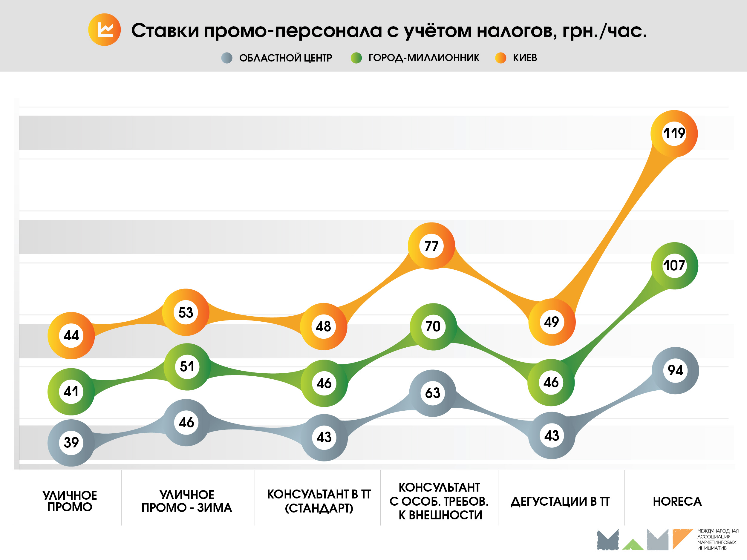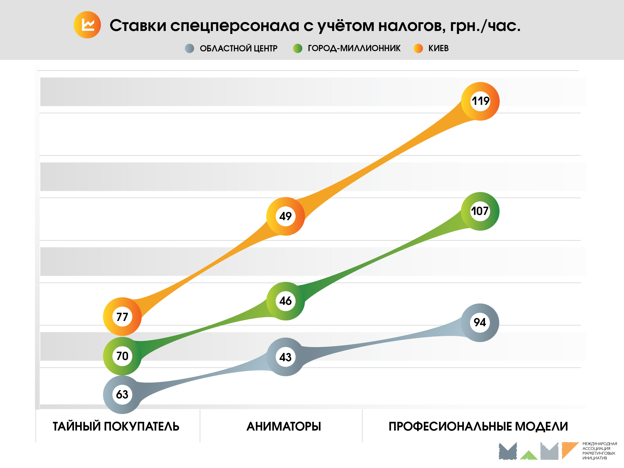 Это уже четвертая волна проекта. 30 агентств-членов МАМИ заполнили он-лайн анкеты, в которых указали средние базовые ставки промоутеров, мерчандайзеров, супервайзеров, спецперсонала актуальные для Киева, городов-миллионников и областных центров. При формировании отчета, кроме вознаграждения, которое персонал получает «на руки», так же оценивались налоговые отчисления за привлечение «полевых» сотрудников.