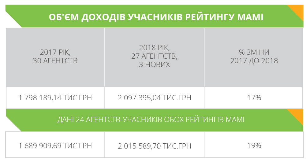 По экспертной оценке МАМИ суммарный объем отрасли в 2018 году составил 5321 млн.грн., что на 17% больше показателей 2017 года. Выводы подтверждают результаты XII Рейтинга агентств маркетинговых сервисов согласно доходам: если сравнить суммарные доходы участников ежегодного исследования 2017 и 2018, обороты в целом увеличились на 17-19%, при этом количество и качество проектов действительно возросла.