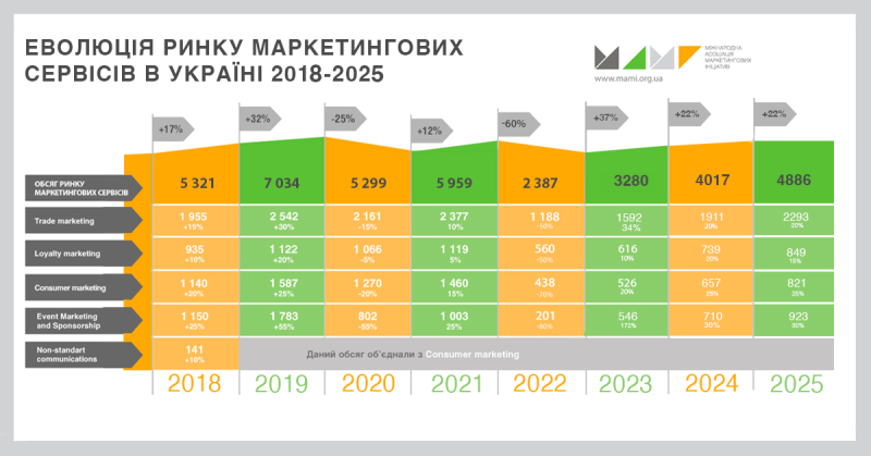 У 2024 році, на думку експертів МАМІ, ринок маркетингових сервісів також продемонстрував значний прогрес у відновленні всіх сегментів. Trade marketing, loyalty marketing збільшилися на 20%, consumer marketing та event marketing – відповідно на 25% та 30% у порівнянні з 2023 роком. Це свідчить про адаптацію бізнесу до нових умов та його здатність не лише витримувати кризові потрясіння, а й формувати нові конкурентні переваги. Наразі проєкти стають більш комплексними та все частіше перетворюються на комунікаційні платформи. Завдяки небайдужості як бізнесів, так і споживачів, кількість проєктів із соціальною складовою також продовжує зростати. Загальне зростання обсягів ринку маркетингових сервісів у 2024 році – 22%.