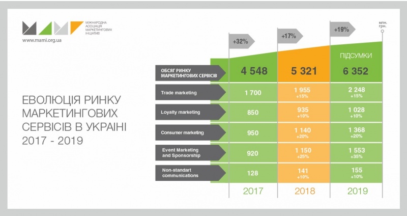 Вже кілька років поспіль спостерігаємо стабільний ріст нашої галузі, у 2019 динаміка +19%, обсяг 6 352 млн гривень. Зростання Event Marketing and Sponsorship на 35%, це - актуальний тренд. Внаслідок емоціонального контакту з брендом споживач отримує додаткову лояльність та мотивацію, отже «мода на івенти» буде щодалі актуальною. Класичні інструменти (Consumer&Trade marketing) не зазнали суттєвих змін, але втілення технологій та креативу у ці напрямки формують додаткову вартість та мають попит у рекламодавців. Зростає інтерес до Loyalty marketing як до засобу дослідження клієнтського досвіду.