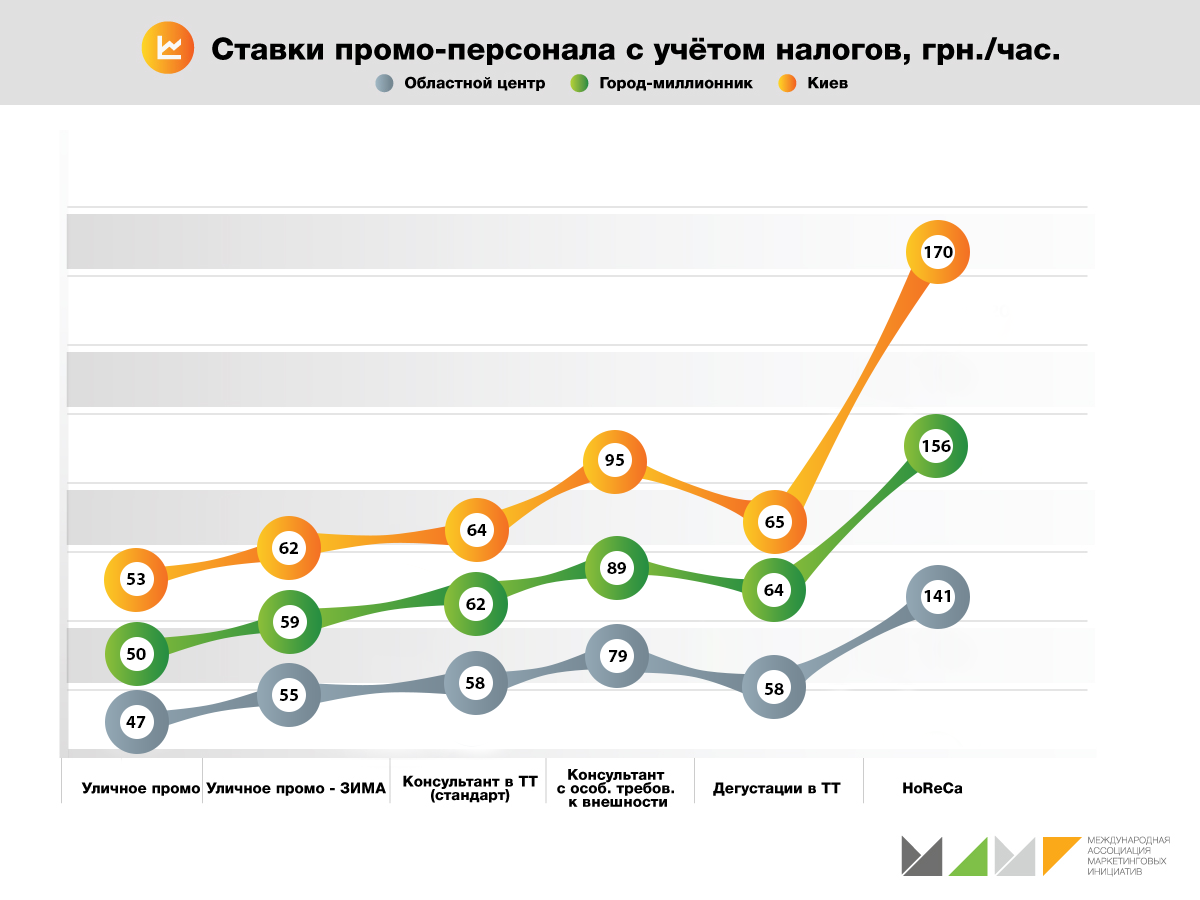 И еще более высокие расценки для промоутеров, умеющих работать в Hоreca, где особые клиенты, особая атмосфера и особые требования. В областных центрах час работы таких ребят стоит 141 грн. (на 43% дороже 2016), в миллионниках – 156 грн., киевская ставка - 170 грн., что на 42% больше 2016.