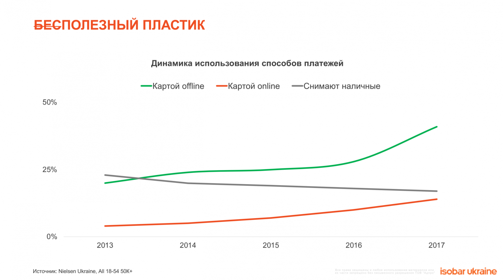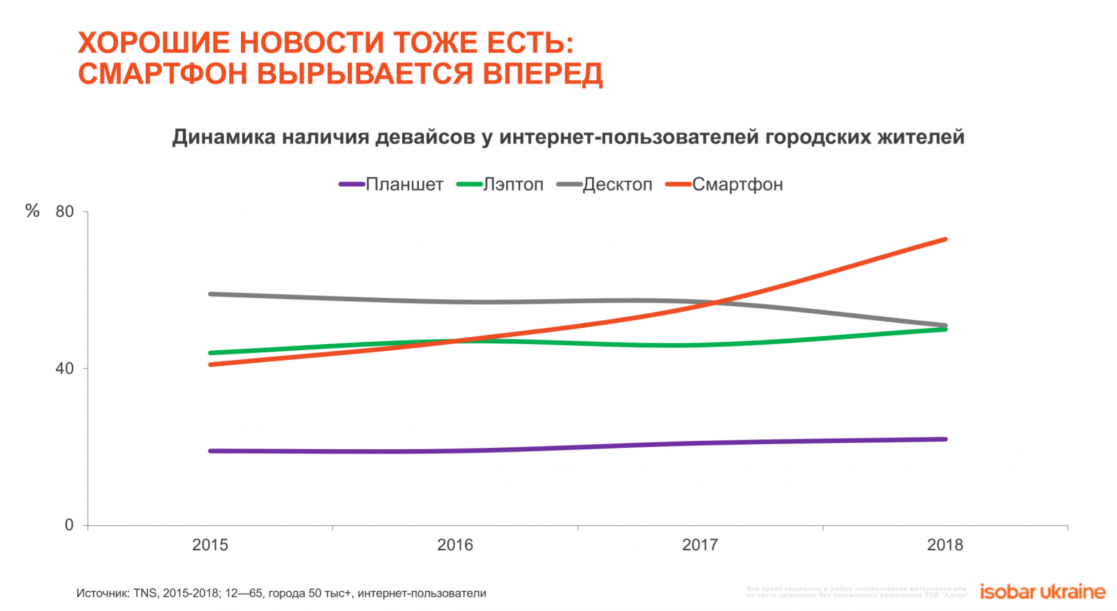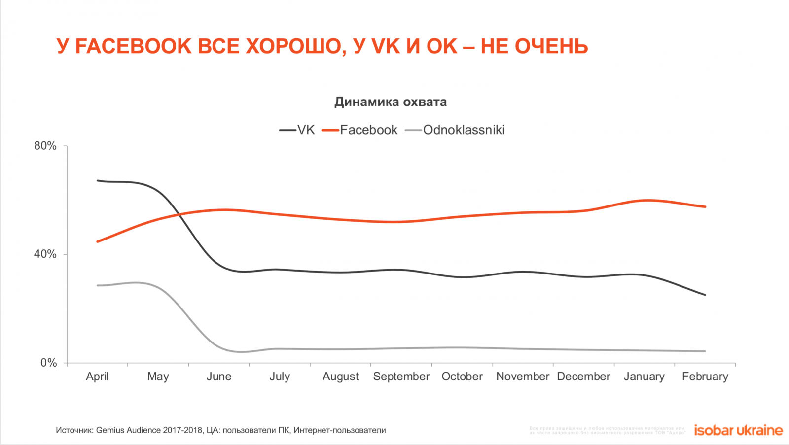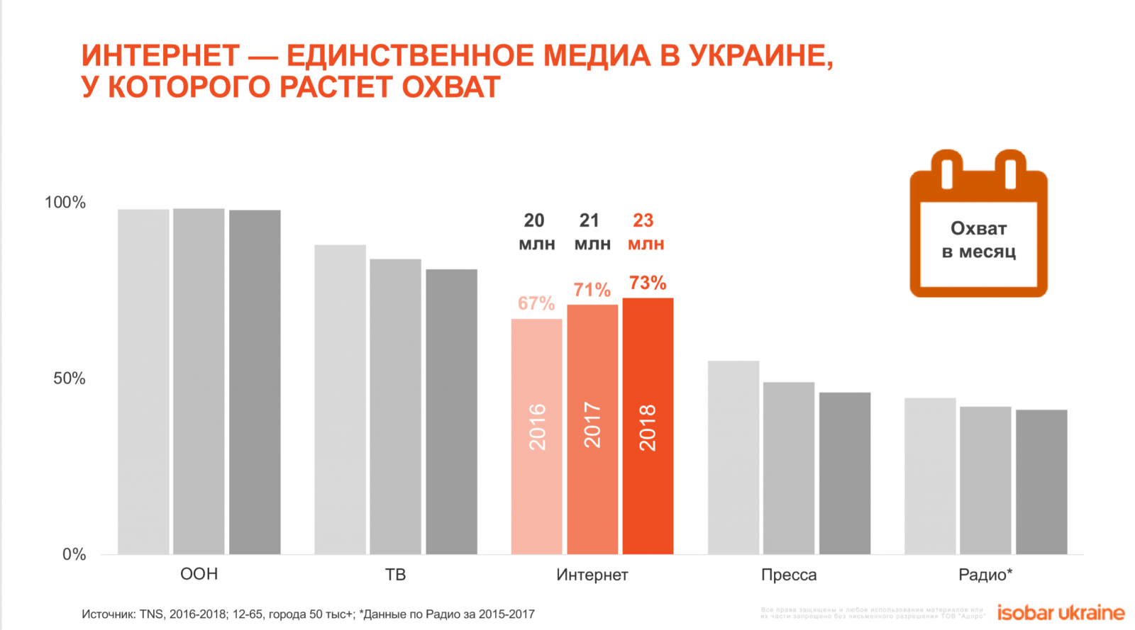 1. Изменение парадигмы от «ТV-centric» к «Digital- centric» теперь уже глобальная данность. В отличии от традиционных медиа, Интернет – единственное медиа, у которого растет популярность среди населения. В 2018 году его охват вырос до 73% или 23 млн пользователей в месяц.
