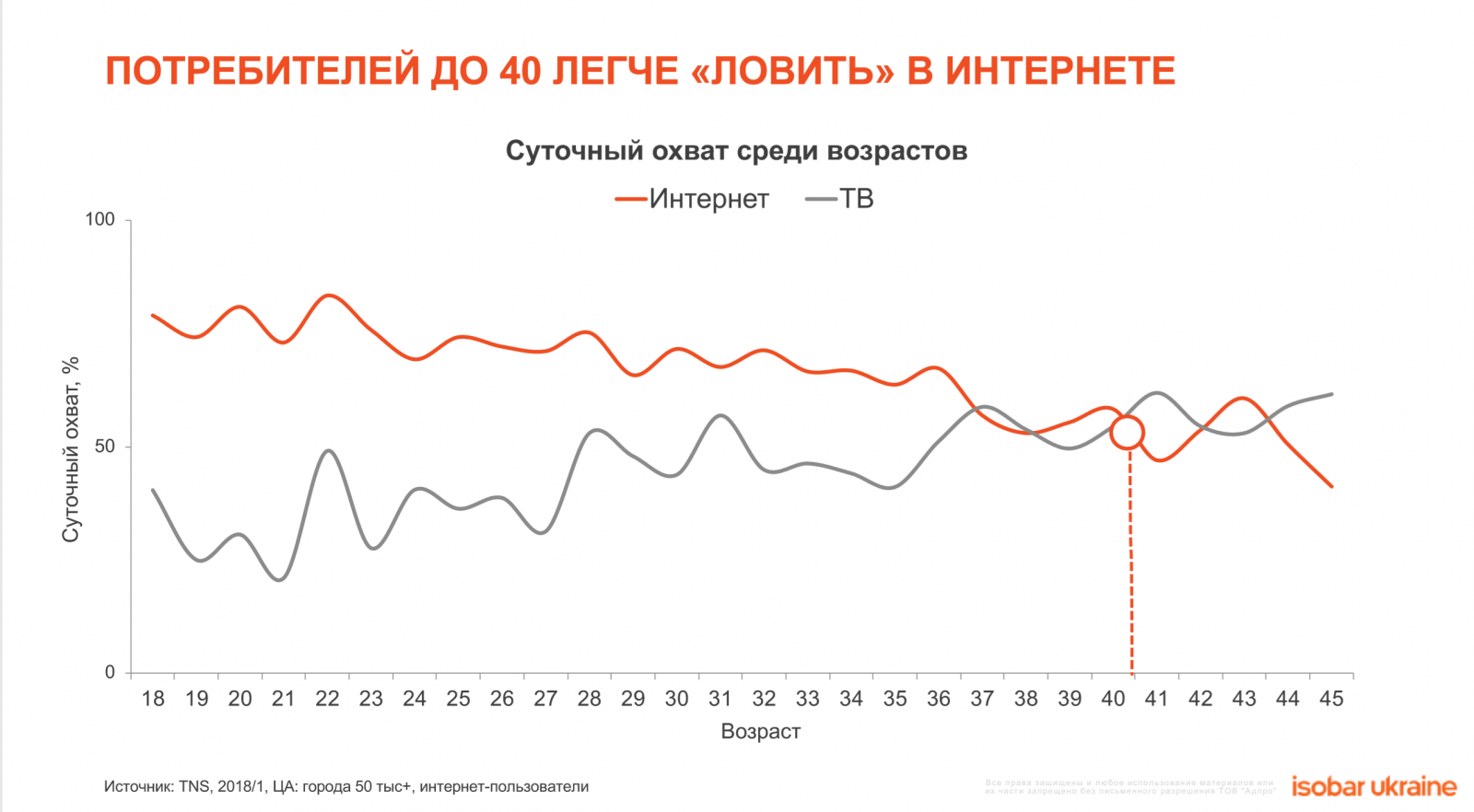 2. Самую интересную для брендов аудиторию в диапазоне от 18 до 40 лет гораздо легче найти в Интернете, чем охватить с помощью ТВ. Эта аудитория в среднем проводит в сети в месяц на 16 часов больше, чем за просмотром телевизора. И даже во время просмотра телепрограмм половина Интернет пользователей параллельно отвлекают на свои цифровые гаджеты.