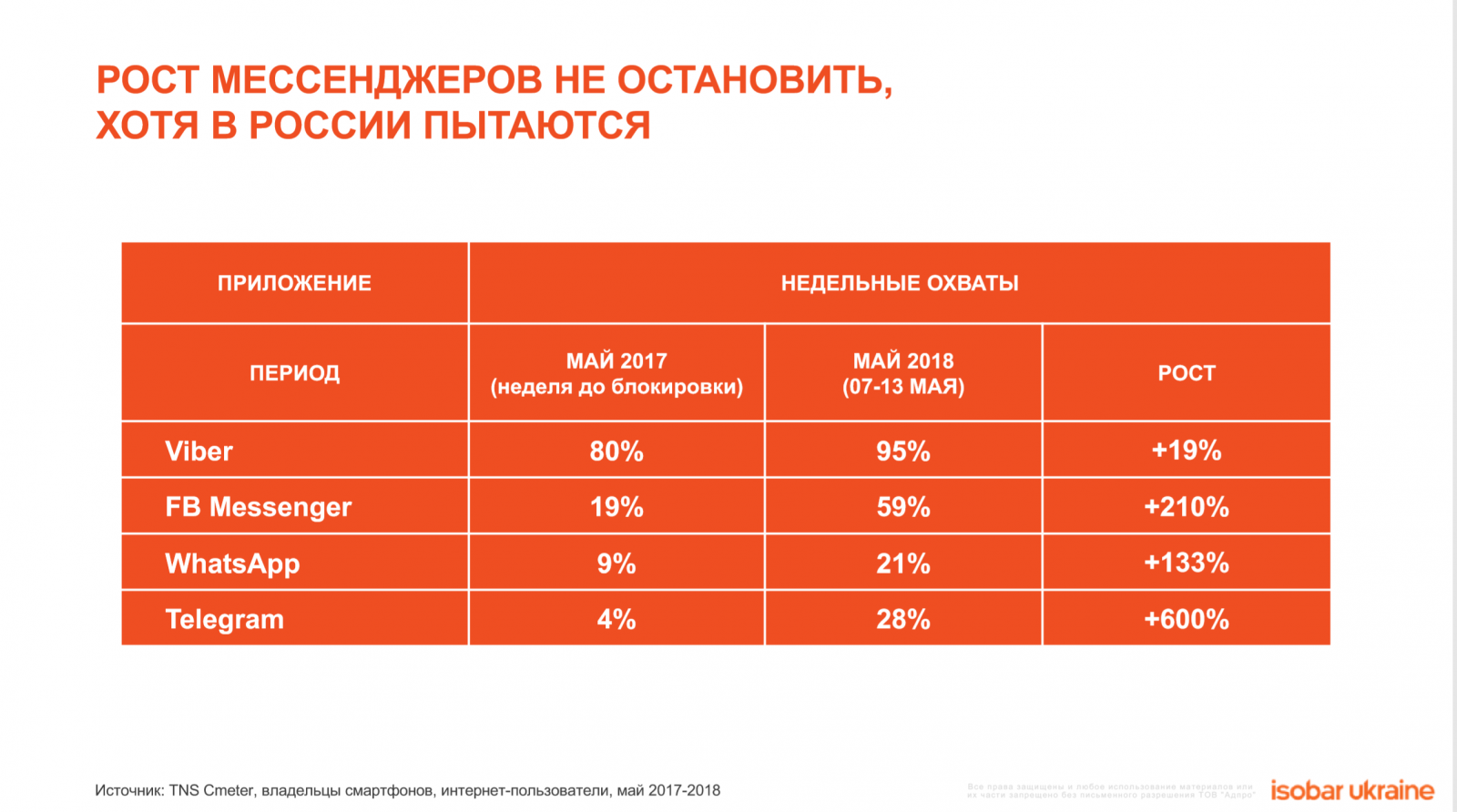 6. Мессенджеры вытесняют уже привычные нам социальные сети. Самым быстрорастущим оказался telegram с ростом охвата на 600% за год.