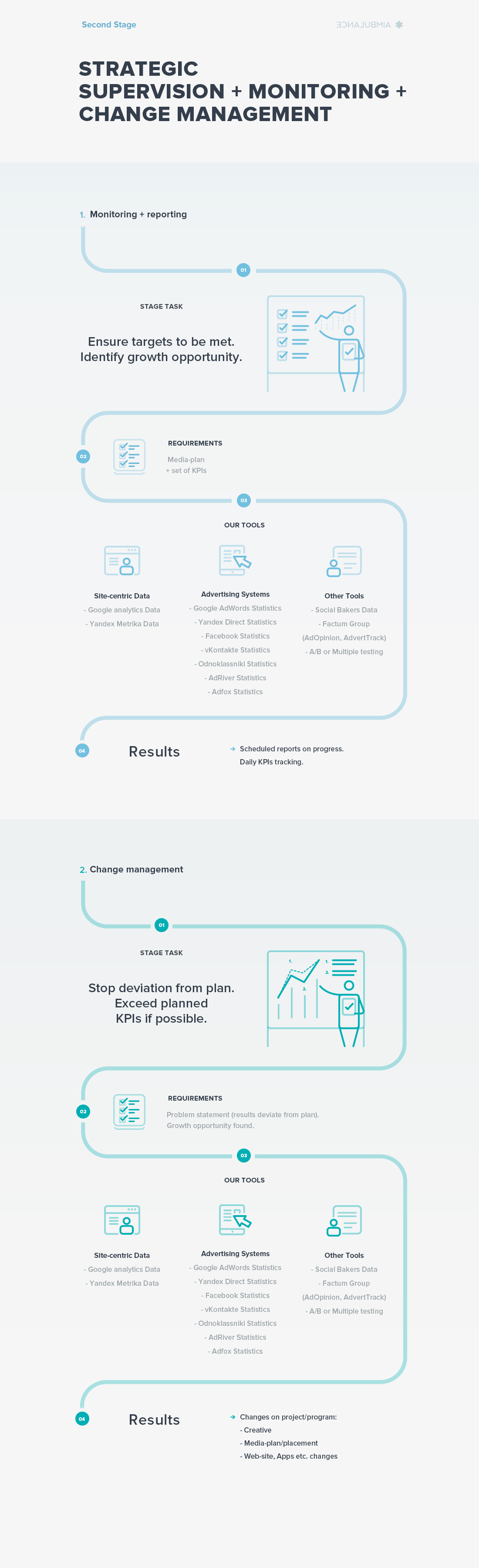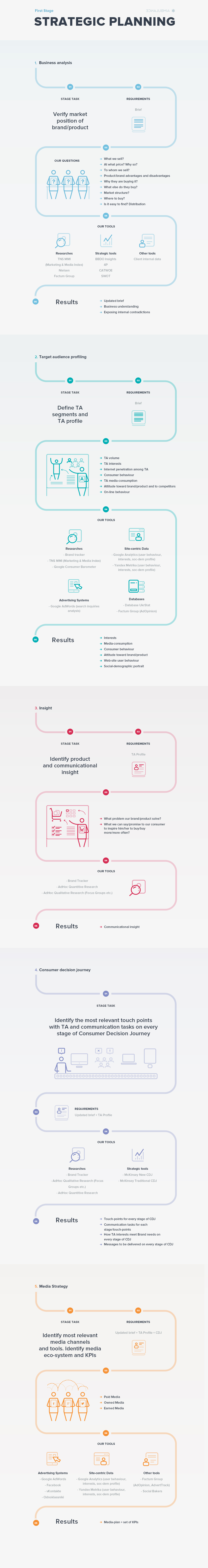 В нашій агенції AIMBULANCE робота стратега наразі має такі етапи і задіює такі інструменти, як показано в інфографіці.
