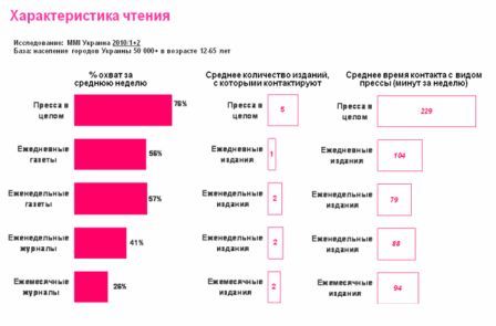 Согласно полученным данным, охват читателей прессы за среднюю неделю составляет 76%; в среднем читатель контактирует с 5 изданиями; средняя длительность контакта с прессой составляет 229 минут (за неделю), при этом больше всего времени приходится на ежедневные издания – 104 мин.