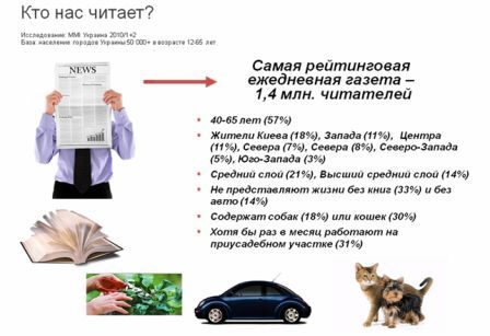 Чтобы детальнее изучить аудиторию прессы, рассмотрим пример – самую рейтинговую ежедневную газету (1,4 млн. читателей).