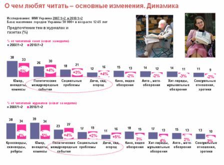 За это время на 5% сократилось количество читателей газет, предпочитающих юмористическую тематику. Также сократилась аудитория читателей тех полос газет, где пишут о кино, авто и сексуальных отношениях (уменьшилась на 2 %). Музыкальные обозрения стали читать меньше на 3%.