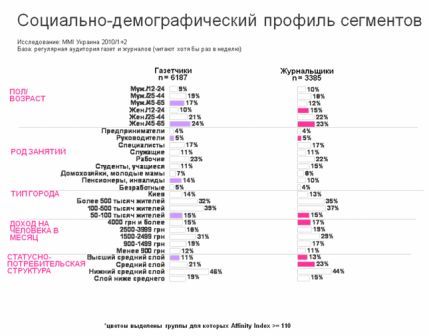 Среди журнальщиков имеют наибольший AffinityIndexи являются целевой аудиторией: женщины в возрасте 12-24 года и 45-65 лет; руководители; жители городов с населением 50-100 тыс. человек; доход 4000 грн. и более; средний и высший средний слой в статусно - потребительской структуре.