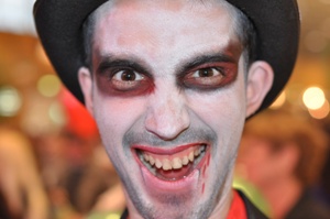 В полдень начала работать секция Costume-handmade. Ребята вместе с дизайнерами придумывали, своими руками делали ужасно модные костюмы тыкв, ведьм, вампиров и тут же наряжались. Чуть позже открылась конкурсная фото-зона. Стилисты и визажисты создавали каждому ребенку в костюме устрашающий грим и прическу. После этого мальчишки и девчонки, полностью преобразившиеся в демонов и монстров, участвовали в фотоконкурсе на лучший костюм. Как настоящие фотомодели, они позировали на фоне праздничного стенда MEGA-Halloween.