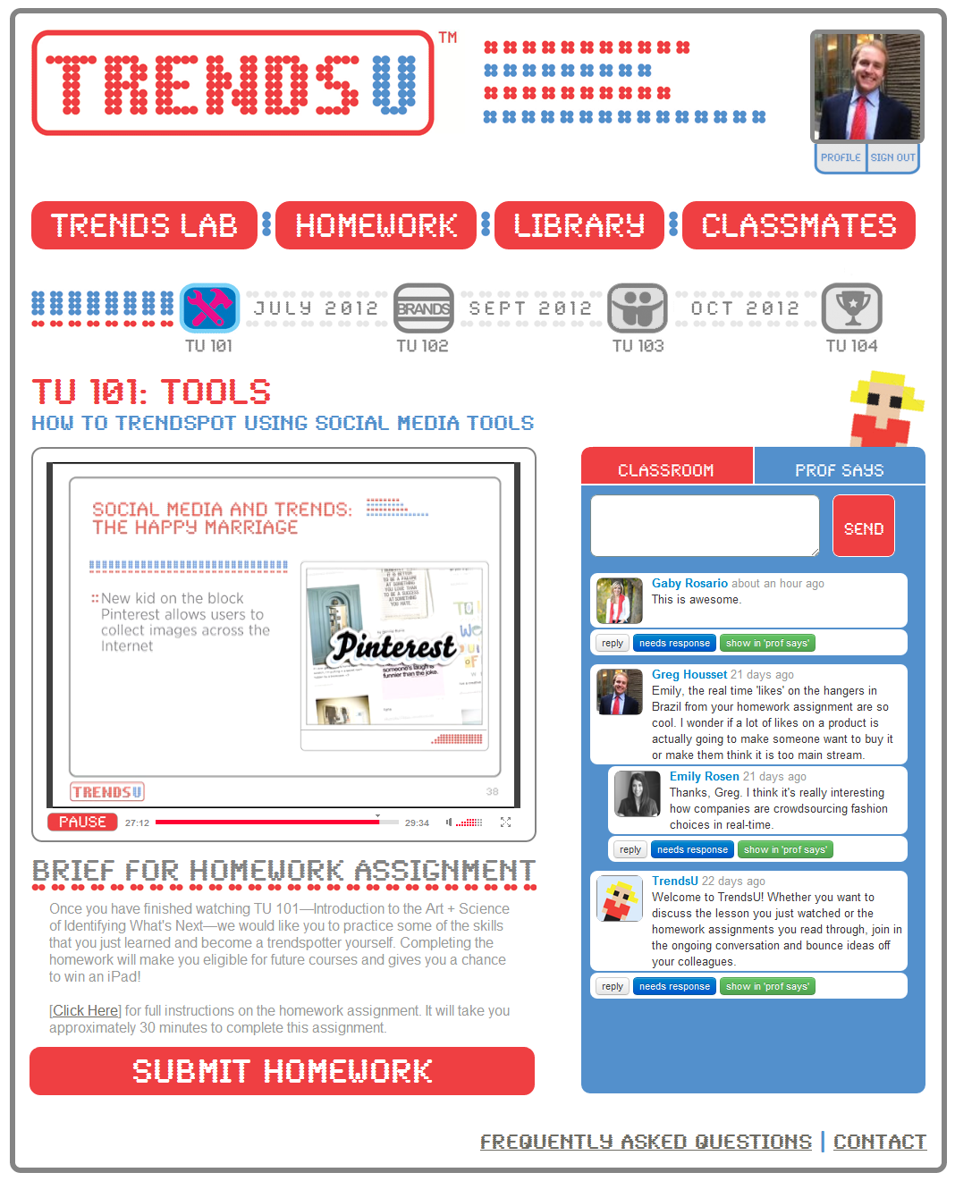 Программа TrendsU предложит сотрудникам Euro RSCG Worldwide обучающий опыт через интерактивный онлайн-ресурс. Участники смогут не только прослушать индивидуальные лекции, но также напрямую общаться со своими преподавателями. Такого рода переписка позволит участникам обсудить насущные темы в реальном времени, а также глубже познать уроки и представленные идеи.