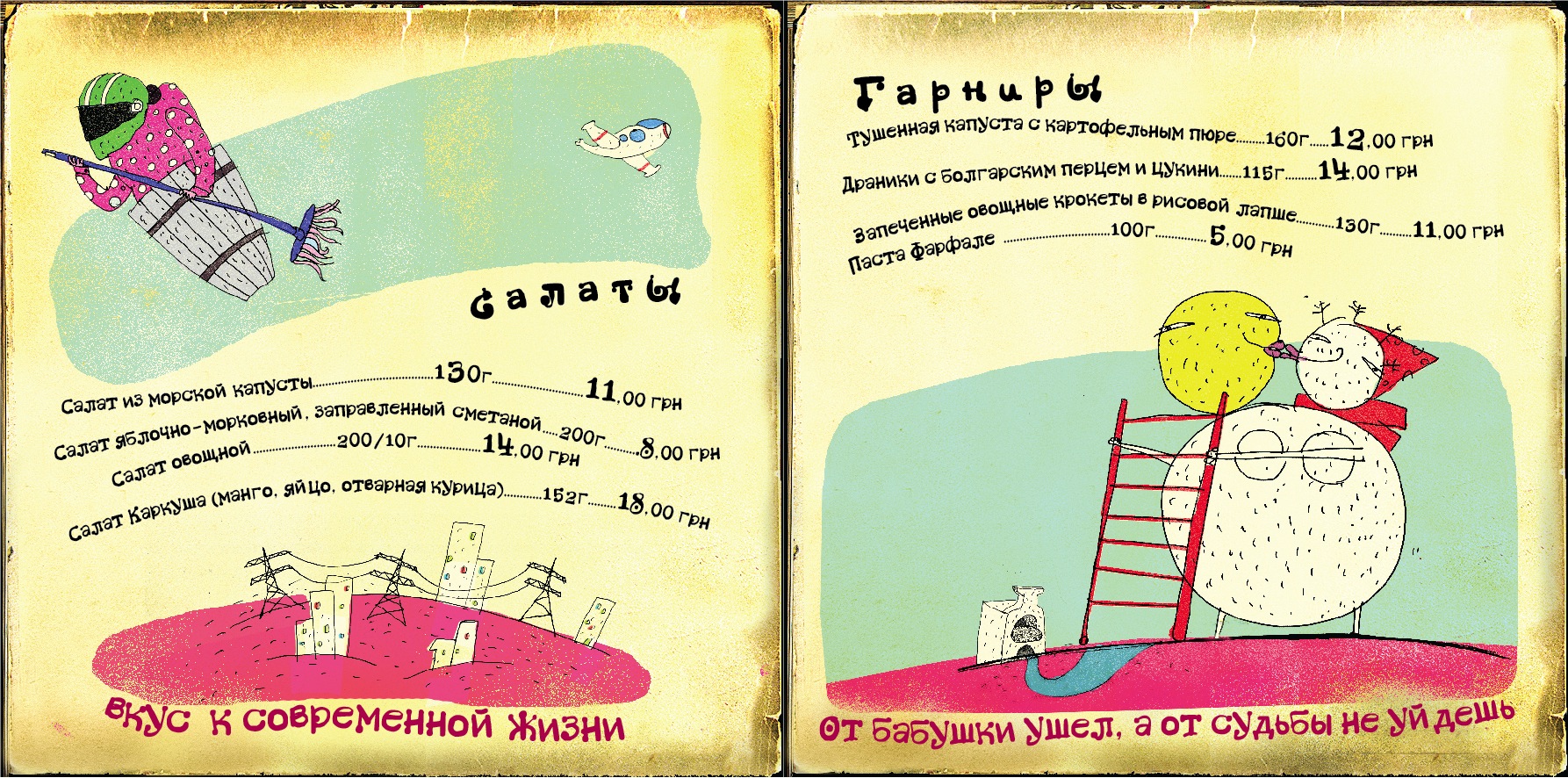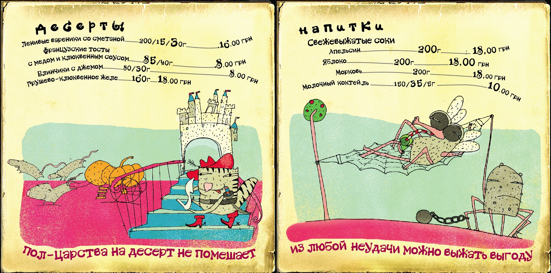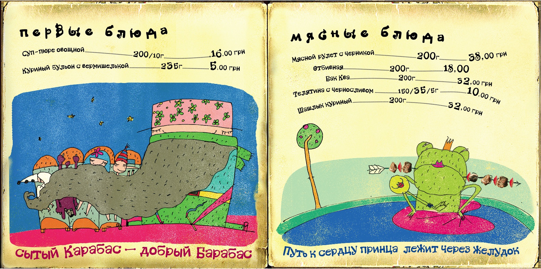Созданное в виде детской книги, меню интересно не только рассматривать, но и читать подписи к иллюстрациям. Каждая картинка отображает узнаваемых героев из известных всем сказок, иногда в непривычных и комичных ситуациях. Баба-Яга, например, вошла во вкус современной жизни, Царевна-Лягушка встречает принца не просто со стрелой, а с нанизанным на стрелу шашлыком, так как путь к сердцу принца лежит через желудок. Колобок нашел не только родственную душу, но и родственное тело в виде снежной бабы, а сытый Карабас-Барабас больше не бьет, а заботливо укрывает своей бородой милых кукол.