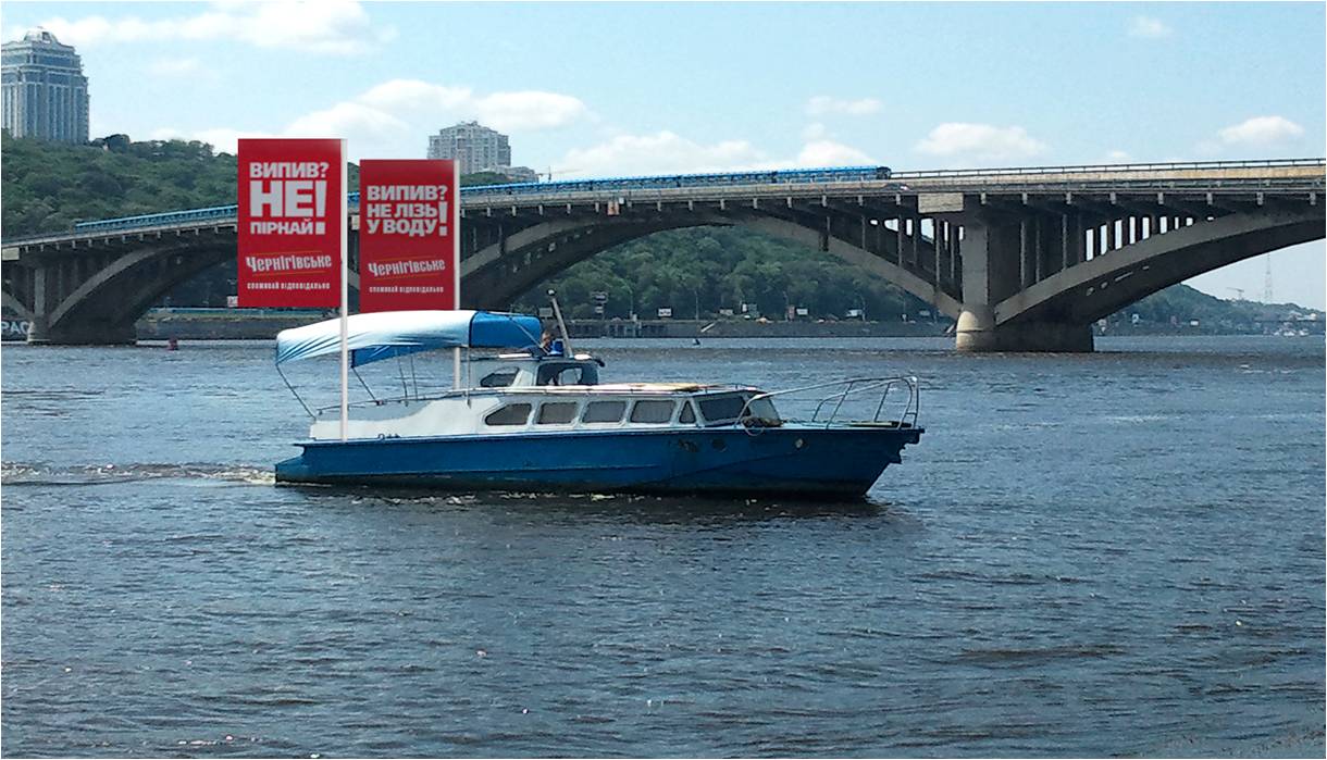 Начиная с минувших выходных начал свои регулярные рейсы специальный катер, оборудованный флагами от ТМ «Чернігівське» с крупными предупреждающими надписями: «Випив? Не пірнай!» и «Випив? Не лізь у воду!». Флаги отлично видны даже издали — размер каждого «полотна» 2,5 х 1,5 м.