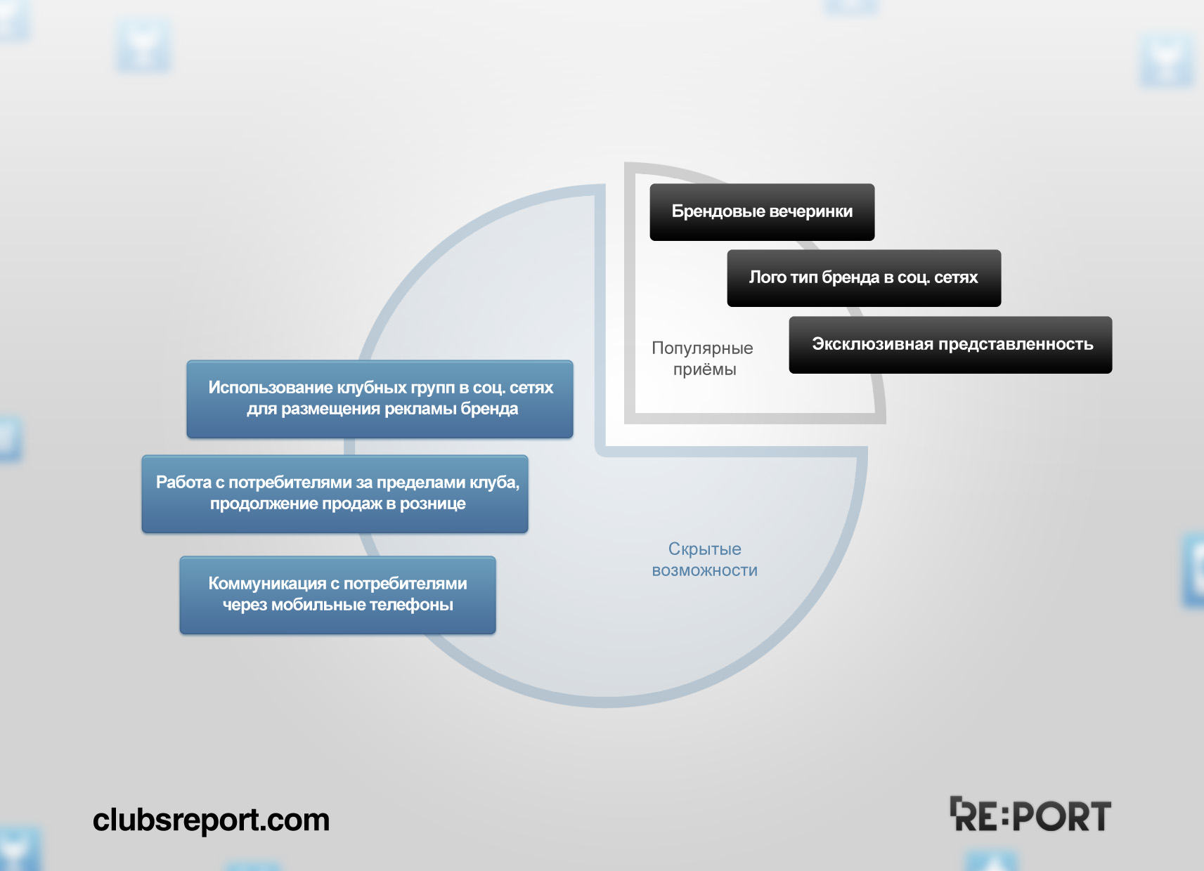 Клубная ниша всегда отличалась несистематизированностью, что осложняло работу с ней. С помощью модулей-инструментов, встроенной аналитики и чётких договорённостей с заведениями в системе, Rе:Port структурирует данный сегмент. Теперь возможностей для спонсорства становится больше. Провести активность в заведении с узкой целевой, но платежеспособной, аудиторией может любой бренд, потребитель которого «обитает» в ночных заведениях.