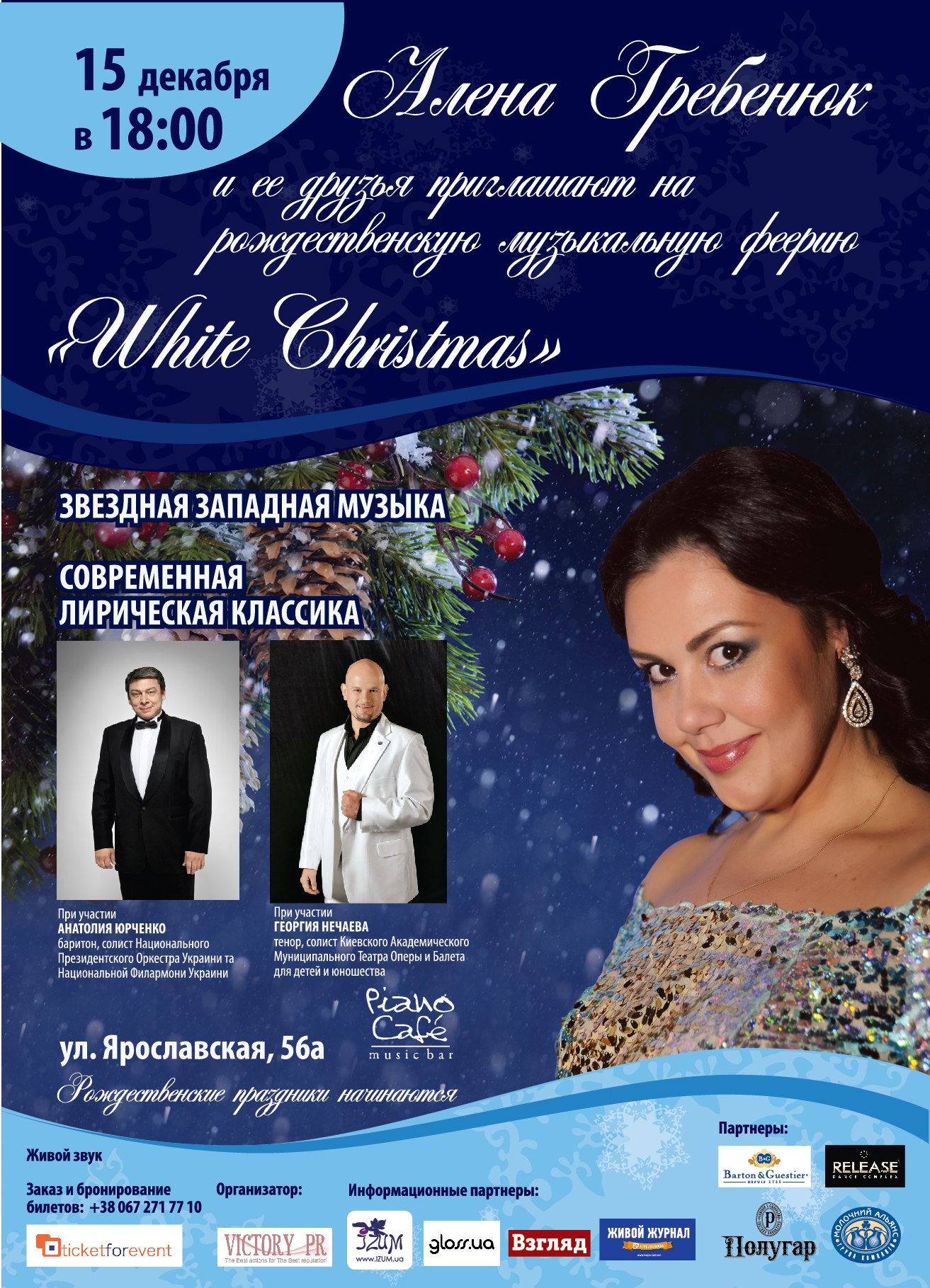 Если Вы любите хорошую западную музыку, мировую классику и любите живой звук, Вас ждут на концерте. Лирическое сопрано Алены Гребенюк, баритон солиста Национальной Филармонии и Национального Президентского оркестра Анатолия Юрченко и тенор солиста Киевского Муниципального Академического Театра Оперы и Балета для детей и юношества Георгий Нечаев - Georg Nechaev сольются в дуэтах и трио.
