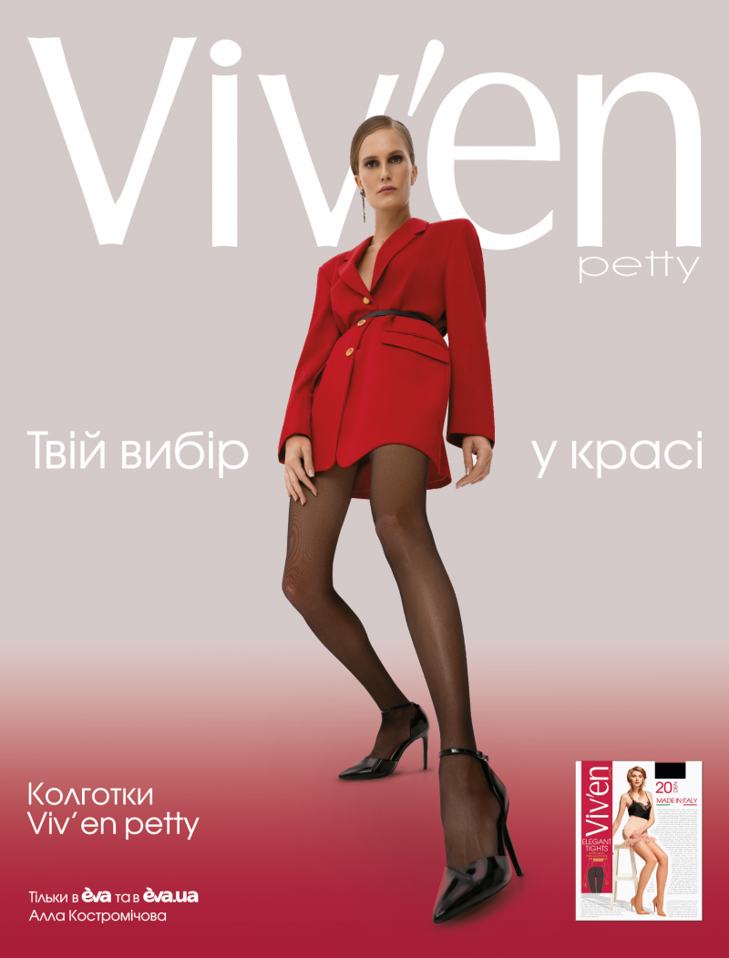 Сеть магазинов EVA представила новую рекламную кампанию своей торговой марки чулочных изделий Viv'en petty. Ее лицом стала Алла Костромичева, топ-модель, ведущая проекта «Топ-модель по-украински» и популярный инстаграм-блогер. Уже с 6 октября зрители телеканалов «СТБ», «Новый», «М1» смогут увидеть новые видеоролики Viv’en petty с Аллой в главной роли.