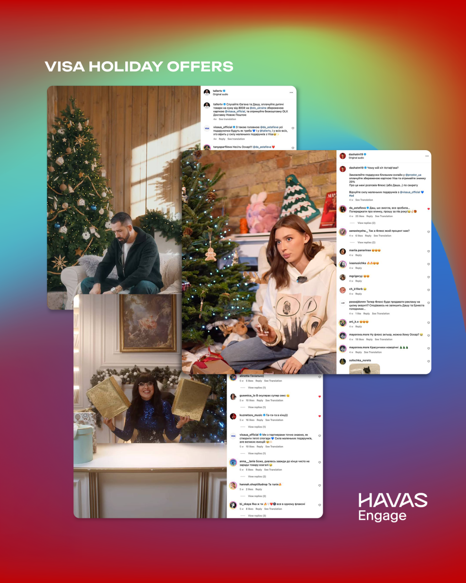 • У кампанії Visa Holiday Offers ми співпрацювали з блогерами для просування святкових пропозицій через Reels, TikTok, Stories та спільні дописи. Кампанія перевищила очікувані результати, а вдало підібрані блогери забезпечили найкращу ефективність колаборацій із Prostor, Аврора, Epicenter та OLX. (фото 1)