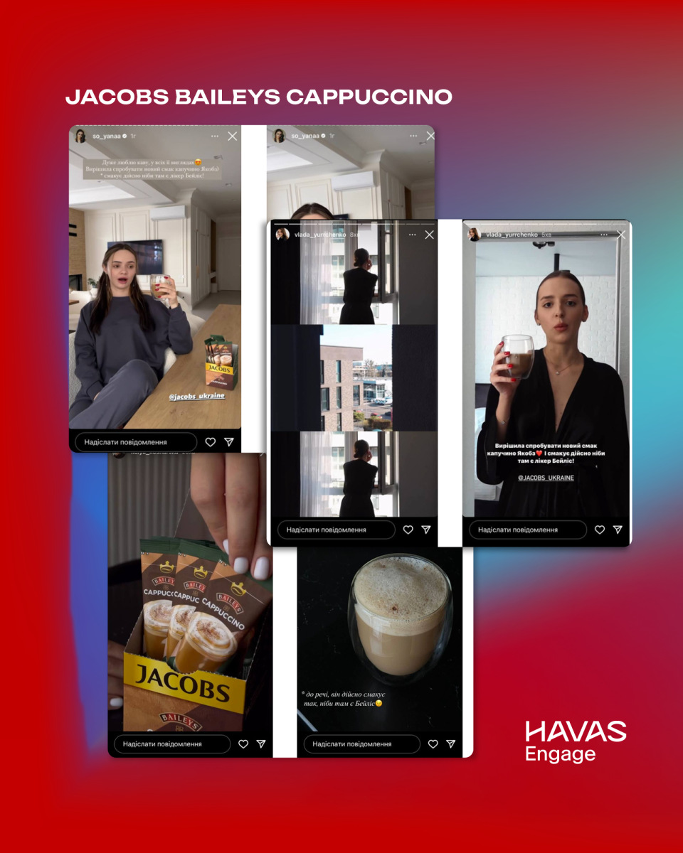 • Рекламна кампанія Jacobs Baileys Cappuccino була побудована на співпраці з блогерами-мільйонниками, які через Stories та Reels ознайомили аудиторію з новинкою та ділилися власними враженнями від дегустації. Такий формат комунікації дозволив перевищити планові охоплення на 438%. (фото 2)