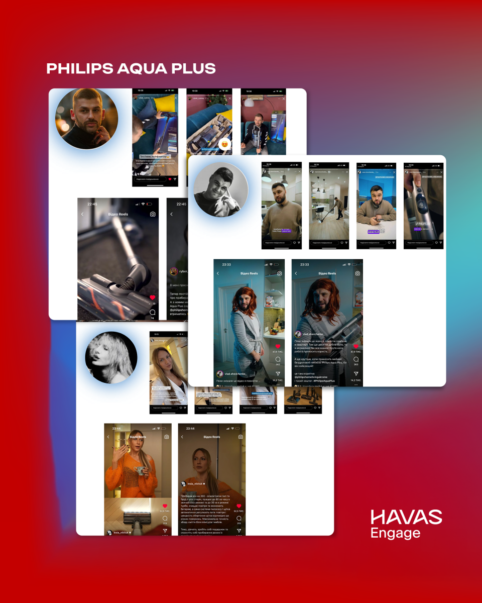 • У кампанії Philips Aqua Plus ключовим елементом стало залучення низки впізнаваних інфлюенсерів, серед яких Андрій Рибак, Леся Нікітюк та Влад Шевченко. Такий підхід дозволив максимально розширити охоплення аудиторії та перевищило планові показники на +254,7%. (фото 5)