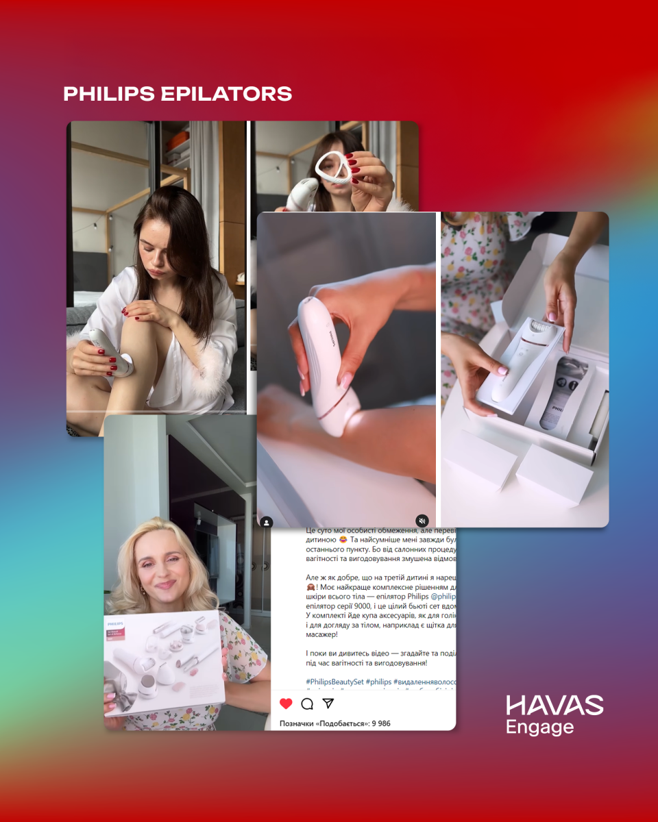 • Кампанія Philips Epilators об’єднала блогерів із різним охопленням — від 27K до 863K підписників, що дозволило протестувати ефективність як мікро-, так і макроінфлюенсерів. Завдяки продуманому брифу та органічній подачі контенту кампанія зібрала 1,6 млн переглядів, доводячи, що якість інтеграції важливіша за кількість підписників. (фото 6)