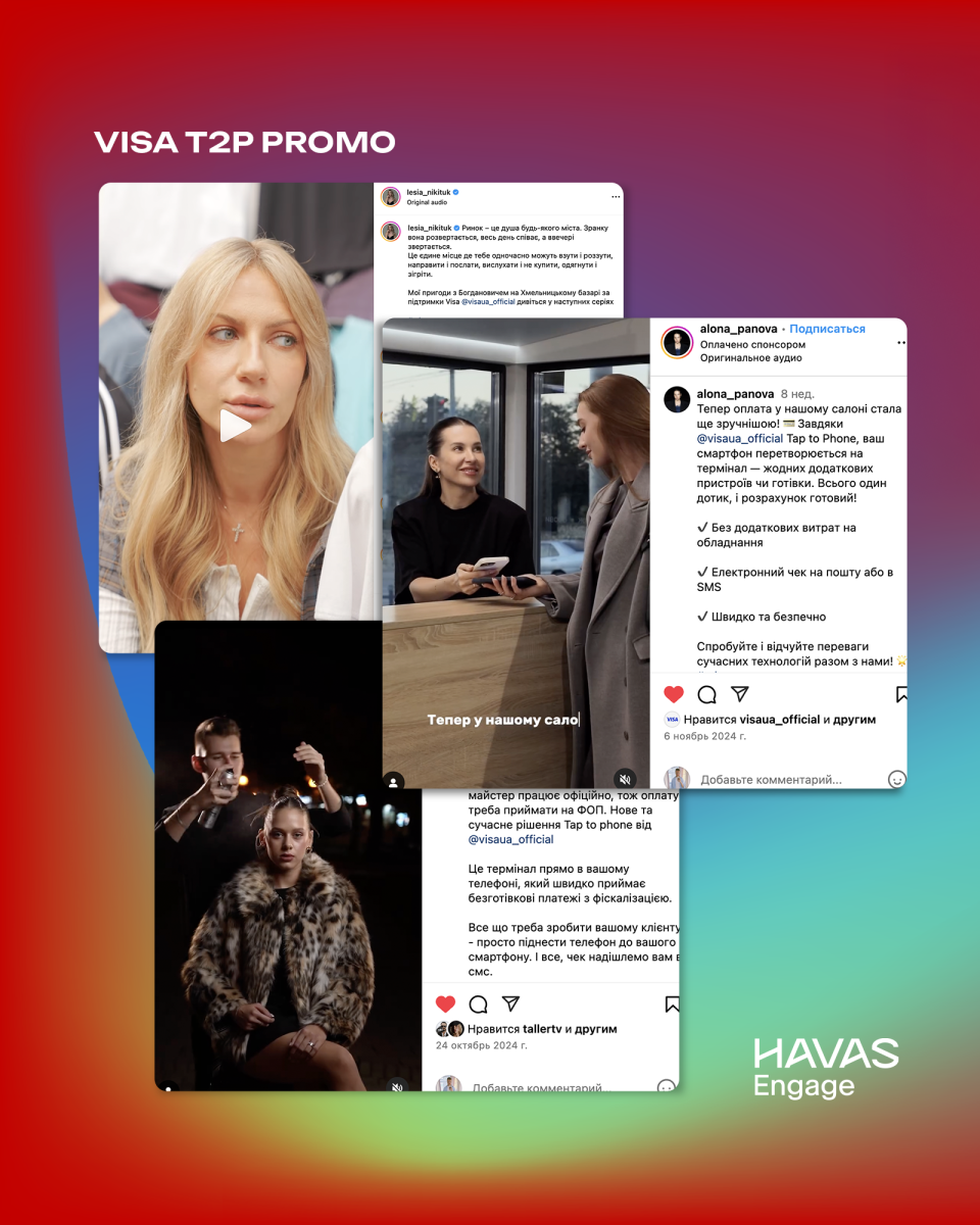 • У кампанії Visa T2P Promo ми зосередилися на органічній інтеграції – блогери демонстрували, як легко та зручно використовувати Tap to Phone у повсякденному житті. Це дозволило зібрати 3,96 млн переглядів. (фото 7)