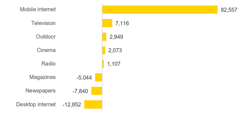 Так как пользователи переключаются с настольных компьютеров на мобильные устройства, а новые пользователи переходят сразу на мобильные устройства, реклама повторяет те же тенденции. Мобильная реклама стремительно растет и забирает долю у других медиа. В 2017 году ее доля выросла на 35% и мы ожидаем, что к 2020 году прирост будет составлять 21% ежегодно.