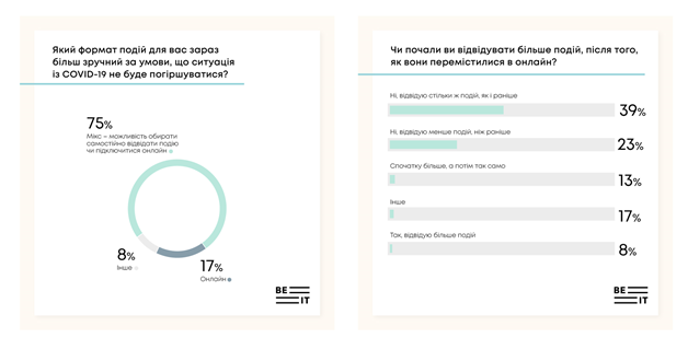 Троє з чотирьох опитаних надають перевагу комбінованим подіям, щоб обирати – відвідати їх чи підключитися до трансляції. Повернутися ж виключно до традиційного офлайнового формату охочих не знайшлось. При цьому журналісти відзначають, що не почали активніше відвідувати події, навіть коли вони з’явились онлайн. А 23% «відвідують» події навіть рідше.