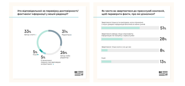 Тільки 5% зазначили, що в їхніх редакціях є окремий спеціаліст, відповідальний за фактчекінг. Більшість відзначає, що факти контролює і перевіряє автор статті або редактор. Для того щоб перевірити інформацію, журналісти, як і раніше, звертаються до пресслужби компанії чи організації або «гуглять» в інтернеті. Загалом медіа ретельніше перевіряють суспільно важливі теми й резонансні цитати, інформацію, що походить із соцмереж, російських ЗМІ та анонімних джерел, на які посилаються інші ЗМІ. Також вони намагаються користуватися як джерелом тільки виданнями з репутацією. Загалом близько 70% респондентів не відчули, що обсяг недостовірної інформації в період пандемії зріс порівняно з тим, як було раніше.