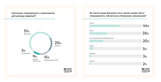 Більшість медіа визнають, що спецпроєкти є важливими для доходу редакції. Причому в роботі над спецпроєктами, на думку опитаних, відбувається досить ефективна взаємодія між ЗМІ та компаніями. Адже їхнє бачення того, якими мають бути спецпроєкти, збігається з баченням замовника у 44% і «50/50» – ще у 26%.
