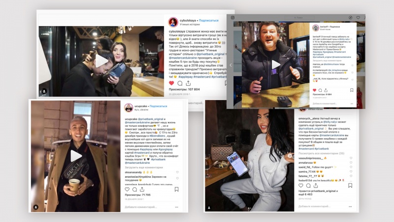 В течении месяца при любойпокупке в трех заведениях Киева, при выборе и оплате Mastercard с Apple Pay или Google Pay, пользователи получали кешбек в размере 5 гривен. Чтобы рассказать про акцию мы использовали различные форматы интеграции в контент популярных киевских блоггеров в Instagram, которые должны были отправиться за покупкой еды в выбранные нами рестораны.