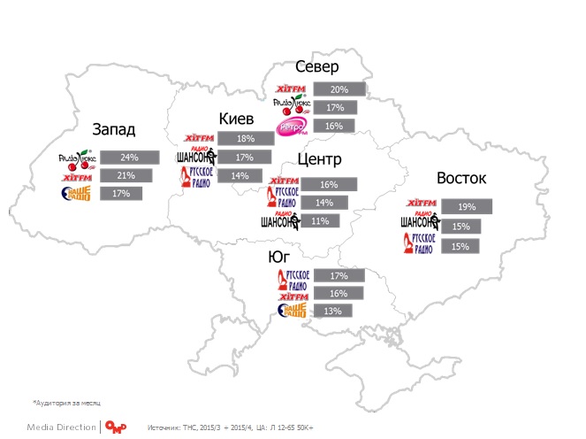 С точки зрения количественных показателей аудитории слушания, то лидирует Север и Киев.