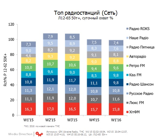 В целом по всей Украине особых изменений в предпочтениях слушания не произошло – тренд развития «Релакс» направления остается стабильным. По-прежнему лидирует Хит ФМ, а на Западе сильны позиции у Люкс ФМ. Можно считать, что наконец завершилась многолетняя борьба за своего слушателя у радиостанции Europa Plus, которая переименовалась в NRj. Контент и продукт остался прежним. И думаю, это будет иметь только позитивное влияние на данную радиостанцию.