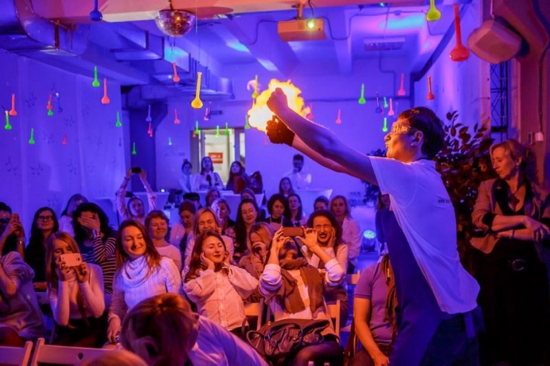 Сюрпризом для гостей стало веселое научное шоу «Битва наук». Битва физики и химии, в которой гости смогли принять активное участие, зарядиться отличным настроением и даже получить небольшой электрический разряд, а также сделать «дымовушку».