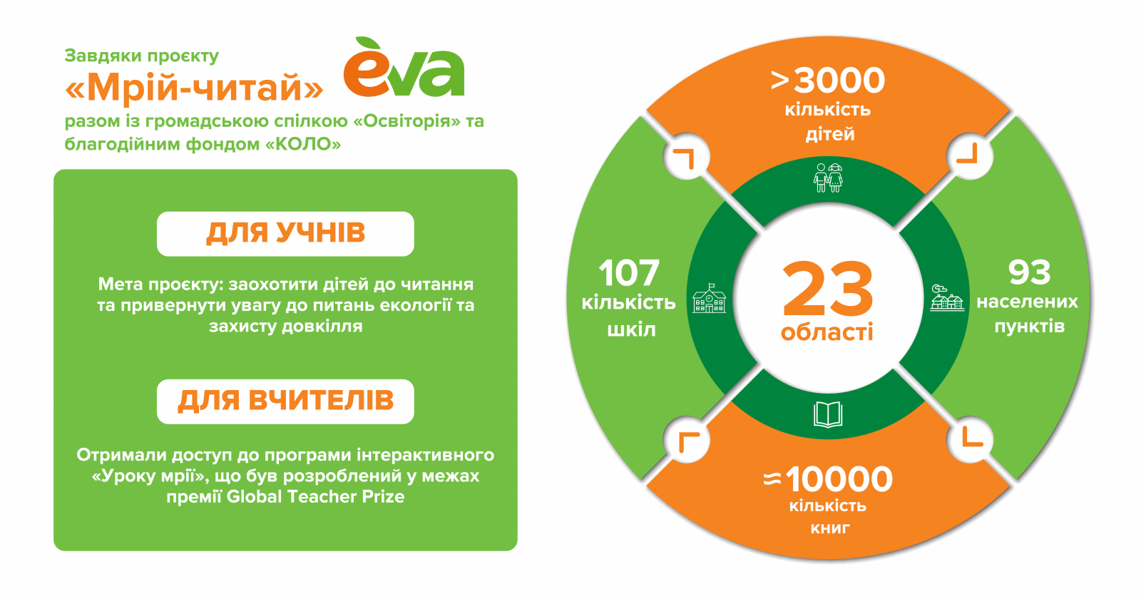 Всеукраинская сеть магазинов EVA успешно воплотила в жизнь проект «Мечтай-читай» для учащихся начальных классов в школах, расположенных в селах и маленьких городках. В рамках проекта, организованного совместно с общественной организацией «Освитория» и благотворительным фондом «КОЛО», EVA отправила серию детских рассказов «Приключения Евы и Рудаськи» в школы в 23 регионах Украины.