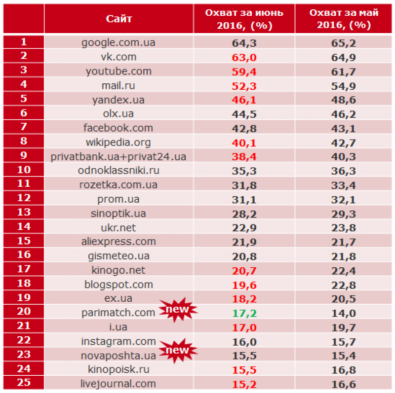 В июне из первых 25 позиций выпали новостные сайты, зато появились 2 новых участника. Высокий интерес украинской аудитории к спортивным событиям и в частности к чемпионату Евро-2016 поднял в рейтинге сайт онлайн ставок Parimatch.com с 31 позиции в мае на 20 позицию в июне. Также, с 26 на 25 позицию поднялся сайт Novaposhta.ua.