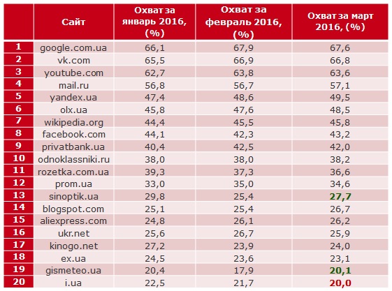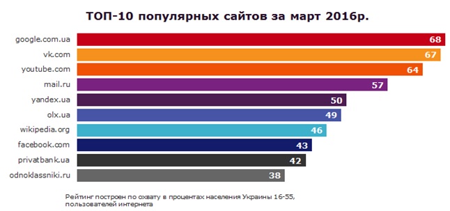 По данным исследования CMeter, компании TNS, никаких сюрпризов на первых местах ТОПа не произошло и неизменной тройкой лидеров популярных сайтов среди украинских интернет-пользователей в марте остаются Google.com.ua, Vk.com, Youtube.com.