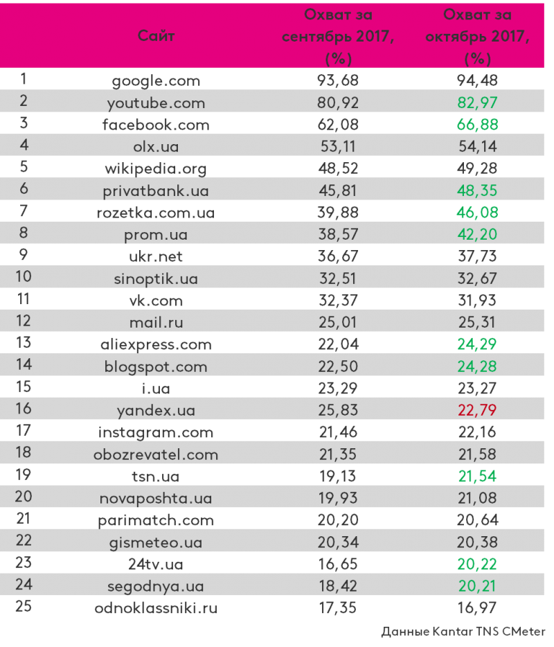 Меньше повезло в этом месяце Yandex.ua, уменьшение охвата на 3% сместило его с 12 на 16 место.