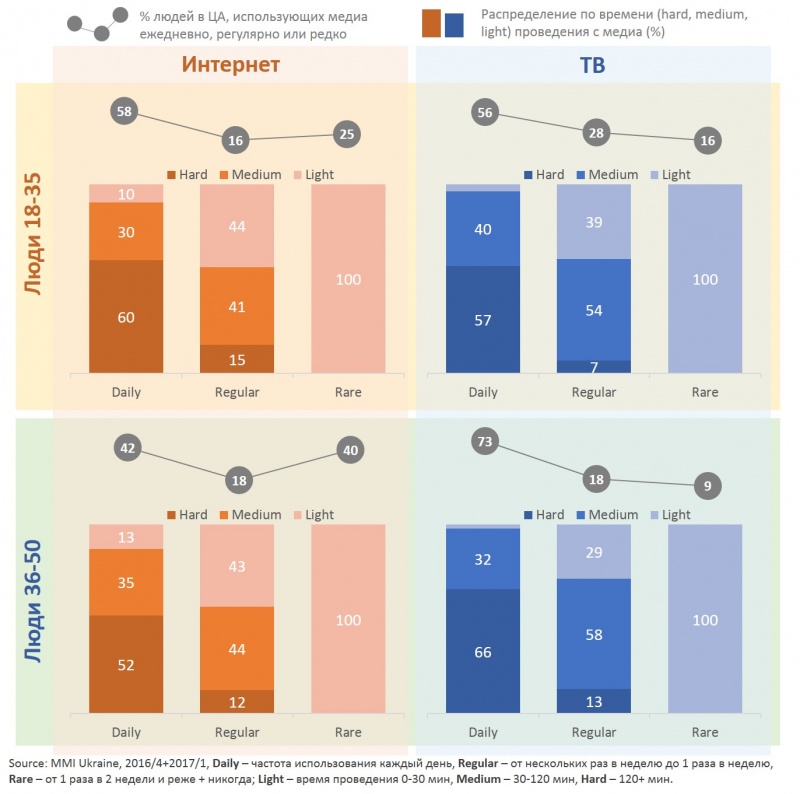 Из графиков видно, что для аудитории в возрасте 18-35 интернет стал медиа №1 по ежедневному потреблению (% аудитории, которая заходит в интернет каждый день составляет 58%). Также интересен и тот факт, что те, кто чаще всего потребляют интернет также пользуются им и дольше всего – 60% из ежедневных пользователей интернета являются hard-юзерами и проводят в нем 2 часа и больше каждый день. Чем моложе аудитория, тем больший в ней % ежедневных пользователей, а среди последних – hard-юзеров. Например для 67% из аудитории 18-25 характерно использование интернета каждый день, такой же % среди них пользуются интернетом 2+ часа в день.