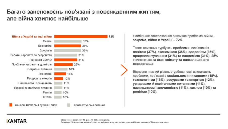 Про це свідчать результати масштабного дослідження «Kantar Global Issues Barometer: світ власними словами», проведеного Kantar серед 10 000 респондентів у 18 країнах світу (57% світового ВВП у 2020 р.). Анкета містила відкриті запитання, аналіз було здійснено з використанням технології штучного інтелекту Kantar TextAI (Intelligent Text Extractor).