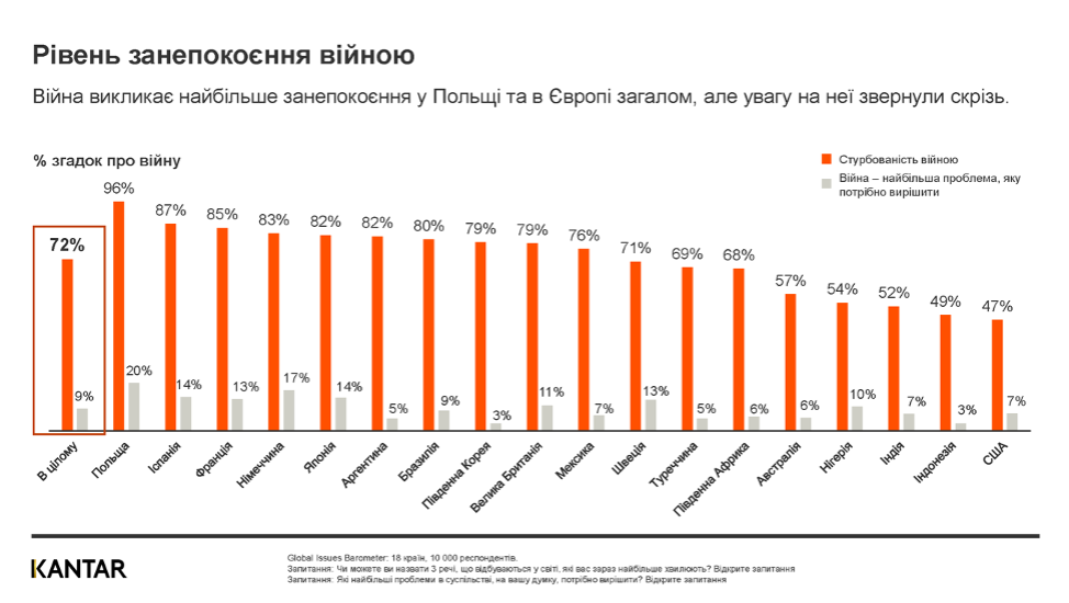 Війна в Україні викликає найбільше занепокоєння у порівнянні з іншими актуальними проблемами в світі, такими як пандемія та інфляційна криза («криза вартості життя»). При цьому війна є нині найбільшим хвилюванням у кожній країні, залученій до дослідження. Про неї згадують не лише у Європі, але також у Південній Кореї та Японії.