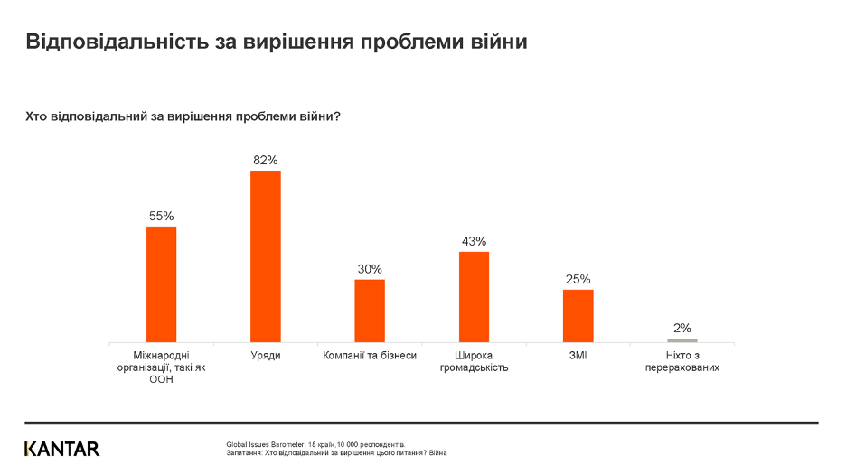 Більшість опитаних покладають відповідальність за вирішення проблеми війн на уряди (82%), значними є також очікування від міжнародних організацій, таких як ООН (55%) та широкої громадськості (43%). 30% сподіваються на дії з боку компаній і бізнесів, 25% – медіа.