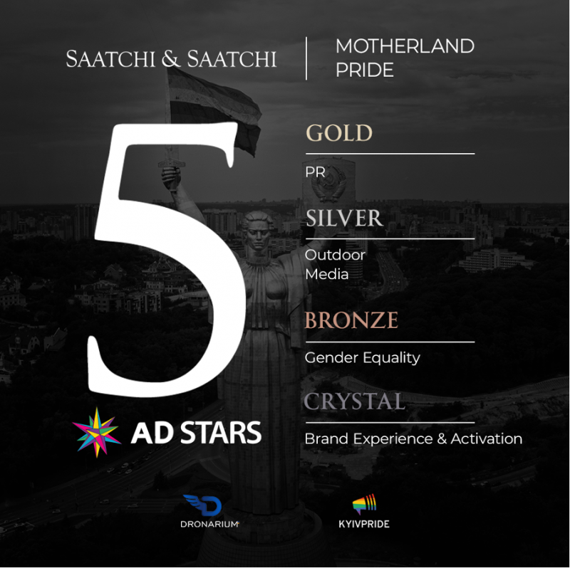 Кейс Motherland Pride, створений Saatchi & Saatchi Ukraine у партнерстві з Dronarium Ukraine для KyivPride здобув нові міжнародні нагороди. Цього разу роботу відзначили серед 1726 фіналістів найбільшого фестивалю креативності в Азії — AD STARS 2021. Робота взяла 5 нагород: золото у категорії PR, срібло у категоріях Outdoor та Media, бронзу у категорії робіт на тему Gender Equality, нагороду Crystal у категорії Brand Experience & Activation. До цього агенція отримала срібло у категорії Outdoor на одному з найбільших та найпрестижніших світових фестивалів креативності Каннських левах 2021.