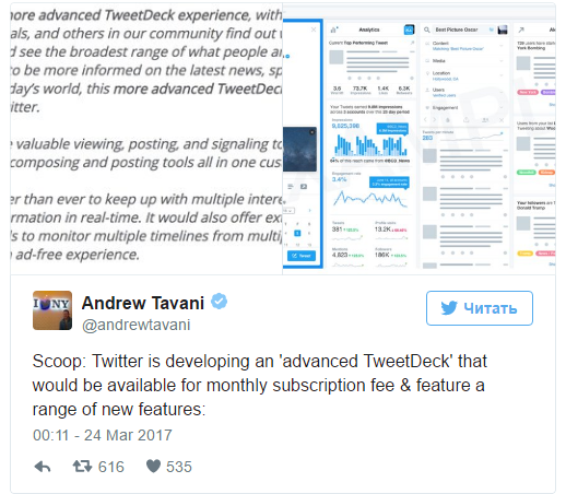 Журналист HuffingtonPost Эднрю Тавани опубликовал скриншот возможного нового дизайна Tweetdeck (приложения-клиента Twitter для более удобной работы с соцсетью). Тавани также приводит якобы текст заявления компании, в котором говорится, что версия Tweetdeck может включать «мощные инструменты для маркетологов, журналистов, профессионалов» и будет распространяться по подписке.
