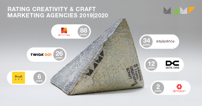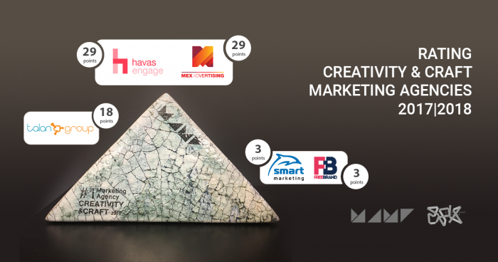 Рейтинг креативности и мастерства (Creativity & Craft) маркетинговых агентств Украины - ежегодный совместный проект с Всеукраинской рекламной коалицией (ВРК), показывает лучшие агентства маркетинговых сервисов по креативности, учитывает награды, полученные на украинских и зарубежных рекламных фестивалях и конкурсах.